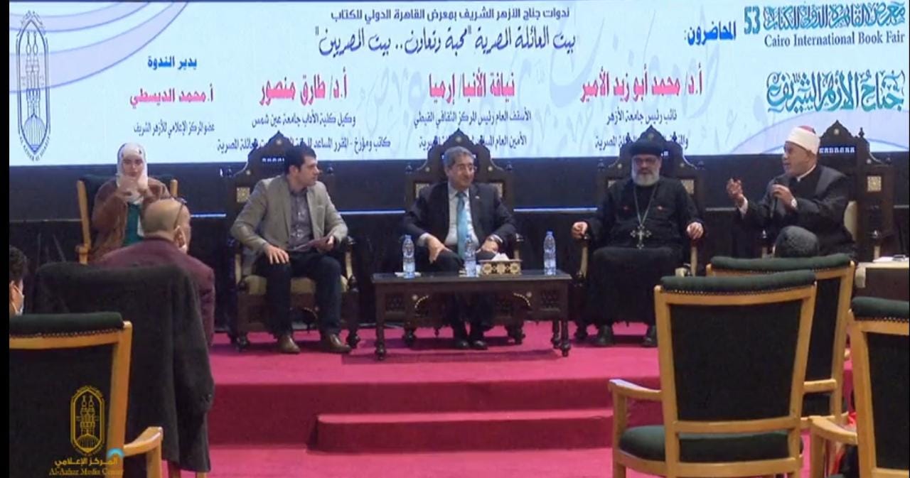نظم جناح الأزهر بمعرض القاهرة الدولي للكتاب في نسخته الـ53، اليوم السبت، عاشر ندواته بعنوان: بيت العائلة المصرية محبة وتعاون.. بيت المصريين، شارك فيها الدكتور محمد أبوزيد الأمير، نائب رئيس جامعة الأزهر للوجه البحري، المنسق العام لبيت العائلة، ونيافة الأنبا إرميا مكرم، كاهن كنيسة العذراء بشبرا، مساعد لجنة الطوارئ ببيت العائلة، والدكتور طارق منصور، وكيل كلية الأدب جامعة عين شمس، المقرر المساعد للجنة الإعلام ببيت العائلة، وأدراها محمد الدياسطي، عضو المركز الإعلامي.
