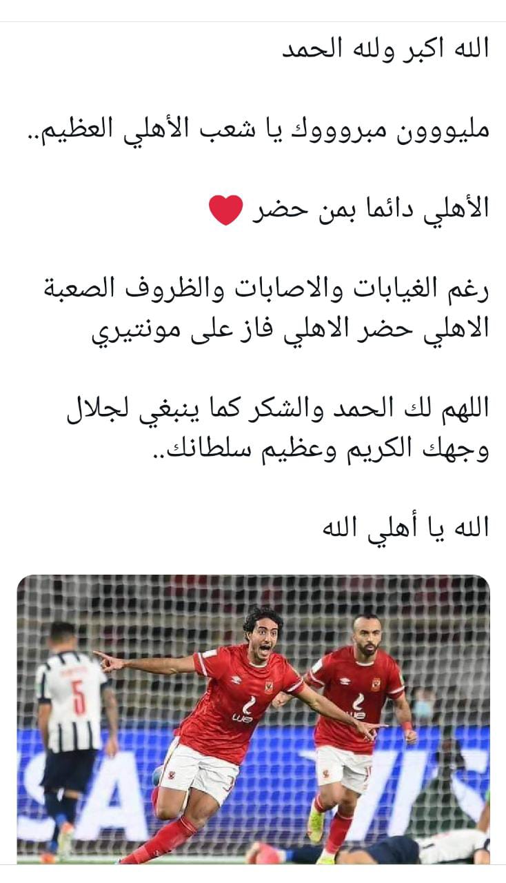 وكتب مستخدم آخر: الله اكبر ولله الحمد، مليووون مبروووك يا شعب الأهلي العظيم، الأهلي دائما بمن حضر، رغم الغيابات والاصابات والظروف الصعبة الأهلي حضر، الأهلي فاز على مونتيري.