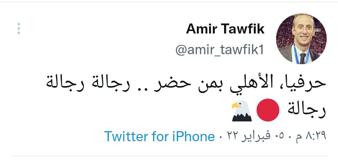 ونشر أمير توفيق مدير التعاقدات بالنادي الأهلي تغريدة عبر تويتر، كتب فيها: حرفيا، الأهلي بمن حضر، رجالة رجالة رجالة.