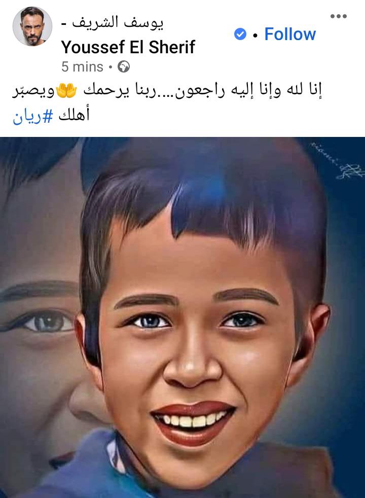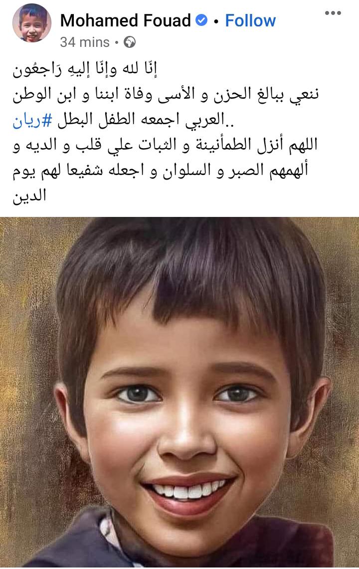 ونعى المطرب محمد فؤاد ريان قائلًا: إنا لله وإنا إليه راجعون ننعى ببالغ الحزن والأسى وفاة ابننا وابن الوطن العربي أجمعه الطفل البطل ريان.. اللهم أنزل الطمأنينة والثبات على قلب والديه وألهمهم الصبر والسلوان واجعله شفيعًا لهم يوم الدين.