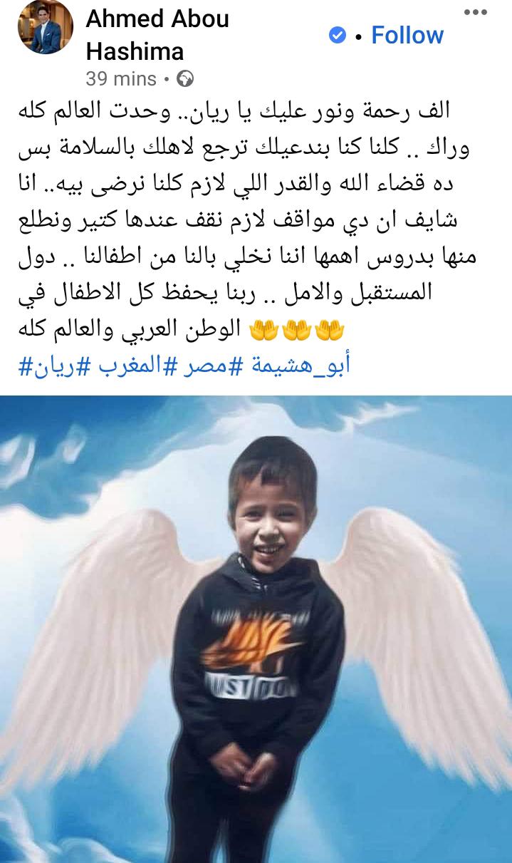 ونعى أبو هشيمة على موقع فيسبوك قائلًا: ألف رحمة ونور عليك يا ريان.. وحدت العالم كله وراك.. كلنا كنا بندعيلك ترجع لأهلك بالسلامة بس ده قضاء الله والقدر اللي لازم كلنا نرضى بيه.. أنا شايف أن دي مواقف لازم نقف عندها كتير ونطلع منها بدروس أهمها نخلي بالنا من أطفالنا.. دول المستقبل والأمل ربنا يحفظ كل الأطفال في الوطن العربي والعالم.