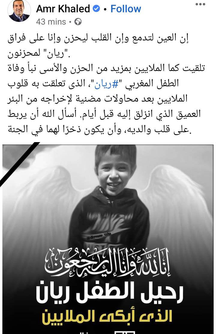 وعلق المذيع والداعي الإسلامي عمرو خالد قائلَا: إن العين لتدمع وإن القلب ليحزن وإنا على فراقك ريان لمحزنون، تلقيت كما الملايين بمزيد من الحزن والأسى نبأ وفاة الطفل ريان، الذي تعلقت به قلوب الملايين بعد محاولات مضنية لإخراجه.