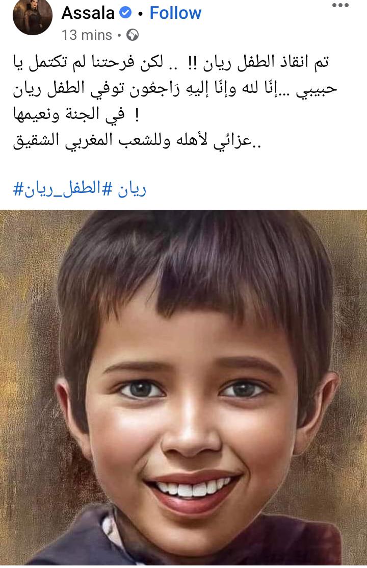 ونعت المطربة أصالة عبر فيسبوك قائلة: تم إنقاذ ريان ولكن فرحتنا لم تكتمل يا حبيبي..إنا لله وإنا إليه راجعون توفي الطفل ريان في الجنة ونعيمها..عزائي لأهله وللشعب المغربي الشقيق.