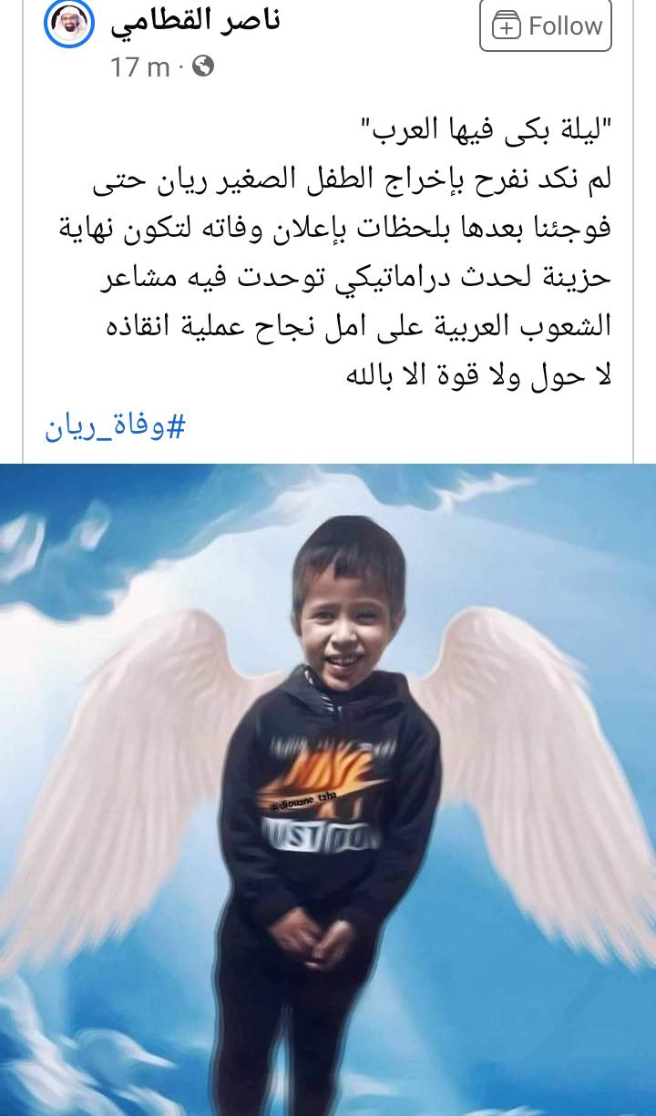 واجتمعت الأمة العربية جميعها على قلب واحد وهو التعاطف مع ريان وأسرته وأهل المغرب بشكل عام، وانتفضت القلوب بعد الإعلان عن وفاة الطفل، وقدموا التعازي والدعوات، ناعين الطفل ريان بكل حزن وأسى، داعين الله بالرحمة والصبر لأهله.