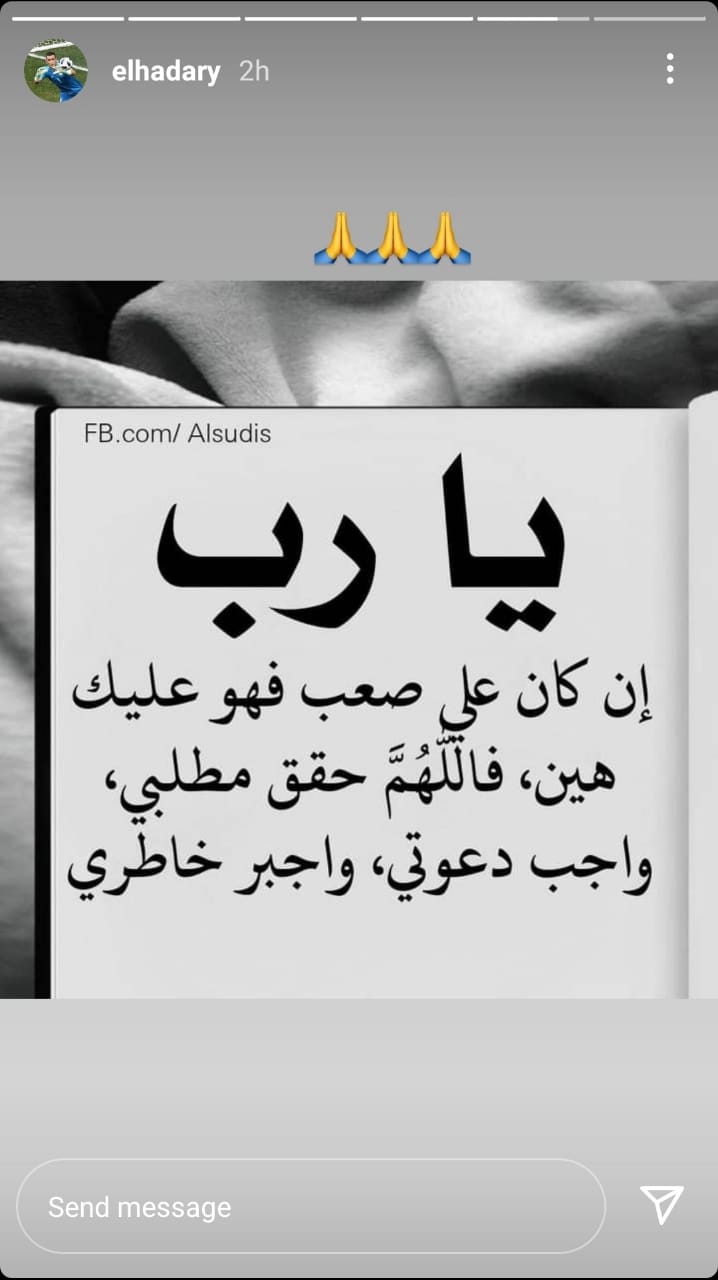 وعبر خاصية القصص المصورة بحسابه على موقع التواصل الاجتماعي إنستجرام نشر الحضري صورة تحمل دعاءً جاء فيه "يارب إن كان علي صعب فهو عليك هين.. فاللهم حقق مطلبي وأجب دعوتي واجبر خاطري".