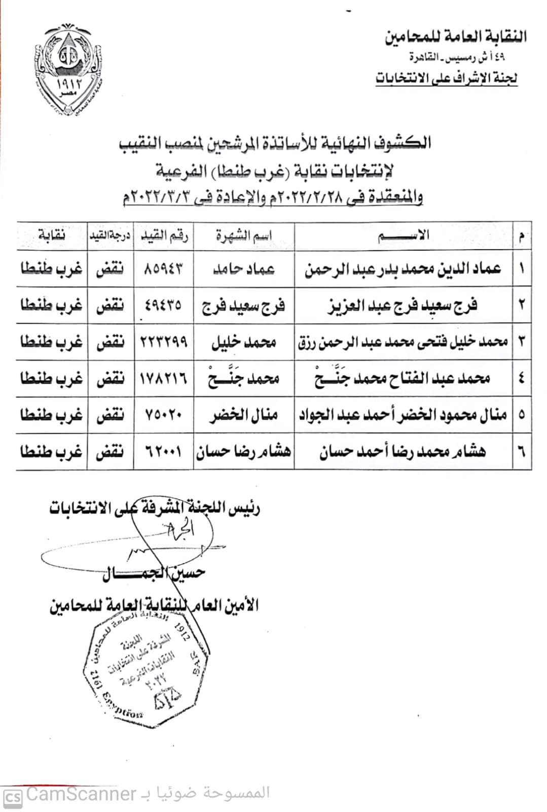 وطبقا للكشف المرفق، فإن المرشحين على منصب نقيب غرب طنطا هم: عماد حامد، وفرج سعيد فرج، ومحمد خليل، ومحمد جَنح، ومنال الخضر، وهشام رضا حسان.