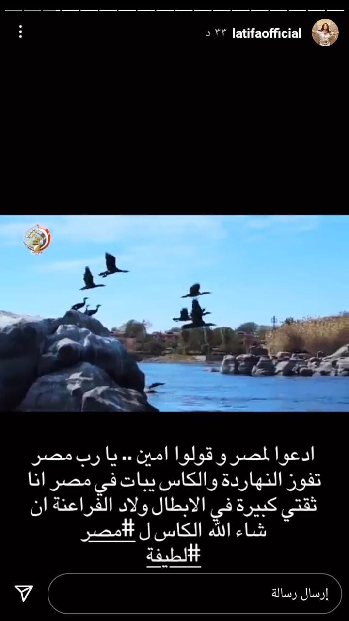 نشرت الفنانة لطيفة مقطع فيديو لها من أغنيتها لمصر على حسابها الشخصي انستجرام، وعلقت: ادعوا النهاردة وقولوا أمين يارب مصر تفوز النهاردة، والكأس يبات في مصر أنا ثقتي كبيرة في الأبطال أولاد الفراعنة، إن شاء الله الكأس لمصر.
