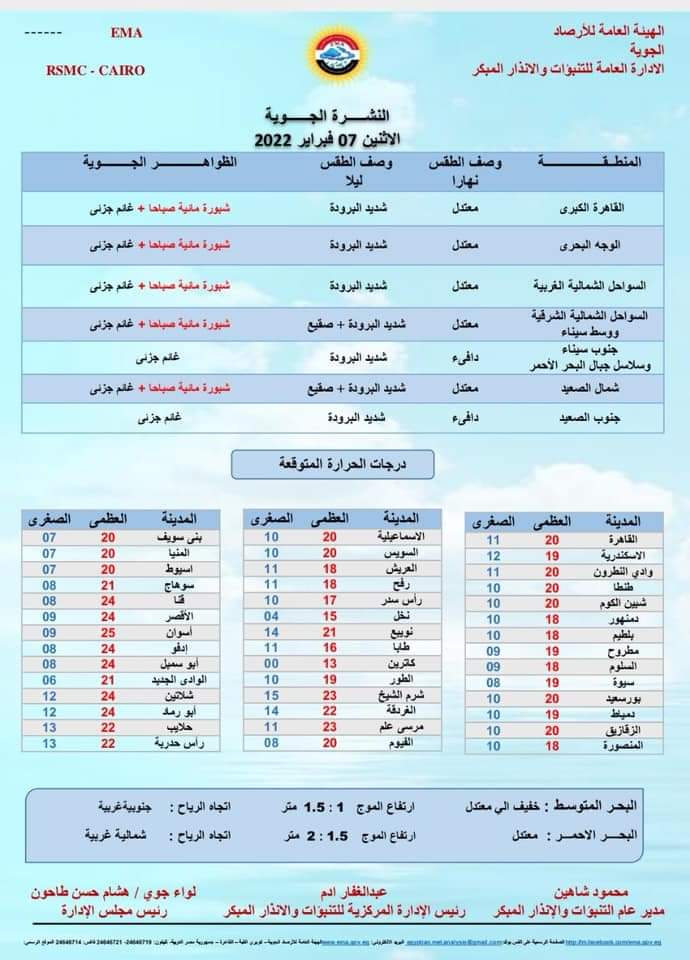 وفقا للنشرة الجوية لهيئة الأرصاد من المتوقع أن يستمر الطقس ليلا شديد البرودة على كافة الأنحاء يصل إلى حد الصقيع على وسط سيناء وشمال الصعيد حيث ما تزال درجات الحرارة الصغرى أقل من 10 درجات مئوية.
