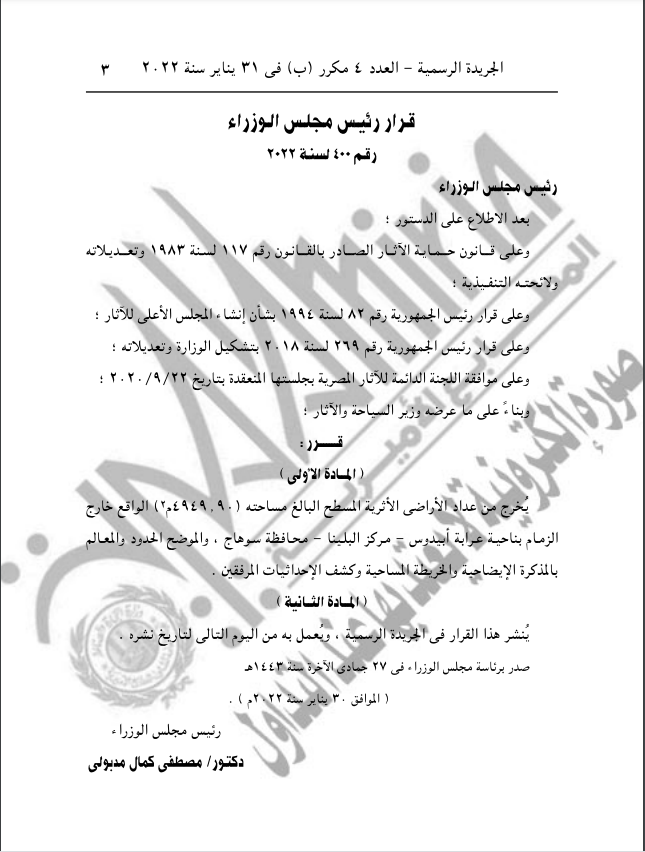نشرت جريدة الوقائع المصرية قرارًا للدكتور مصطفى مدبولي رئيس مجلس الوزراء رقم 400 لسنة 2022 بشأن خروج أراض من عداد الآثار بمنطقة الزمام بناحية عرابة أبيدوس، مركز البلينا، محافظة سوهاج.