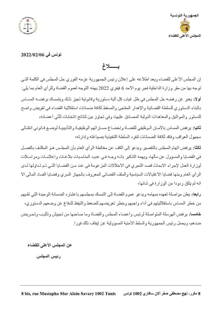 وفي بيان له قال المجلس الأعلى للقضاء التونسي، ردًا على الرئيس قيس سعيد، إنه يرفض حل المجلس في ظل غياب كل آلية دستورية وقانونية تجيز حله من قبل الرئيس، معلنًا تمسكه برفضه المساس بالبناء الدستوري للسلطة القضائية، بوصف قرارات الرئيس التونسي بشأن حل المجلس بأنها تقويض واضح للدستور والمواثيق والمعاهدات الدولية المصادق عليها.