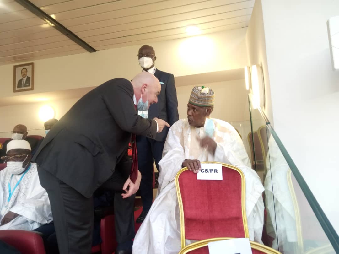 تواجد الكاميروني عيسى حياتو رئيس الاتحاد الإفريقي الأسبق لكرة القدم، وجياني إنفانتينو رئيس الاتحاد الدولي لكرة القدم، في ملعب مباراة مصر والسنغال لحضور نهائي كأس أمم إفريقيا 2021 المقامة بالكاميرون.