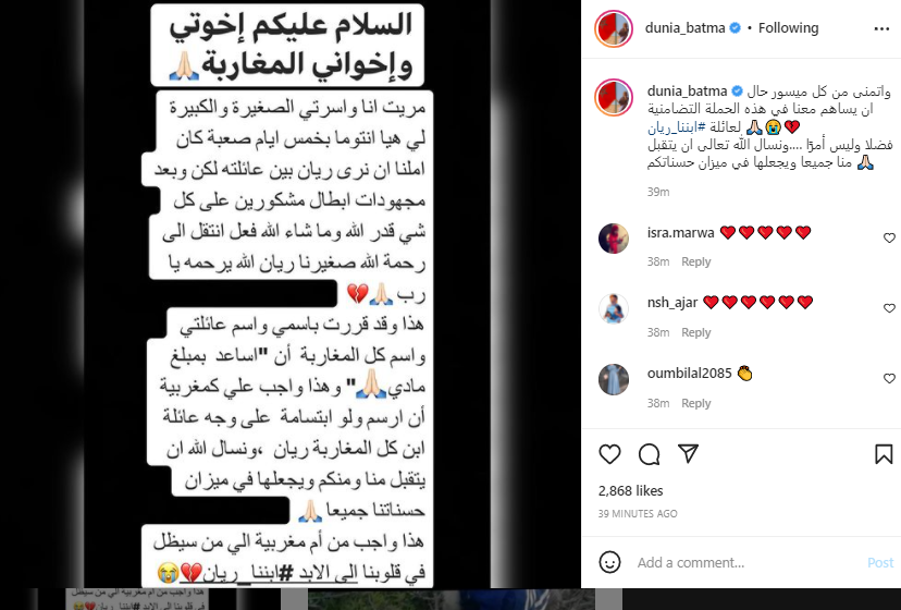 وكتبت دنيا بطمة في منشور عبر حسابها بموقع تبادل الصور والفيديوهات انستجرام: مريت أنا وأسرتي الصغيرة والكبيرة لي، وهي أنتم بـ 5 أيام صعبة، كان أملنا أن نرى ريان بين عائلته، لكن بعد مجهودات أبطال مشكورين على كل شيء، قدر الله وما شاء الله فعل، انتقل إلى رحمة الله يا رب.