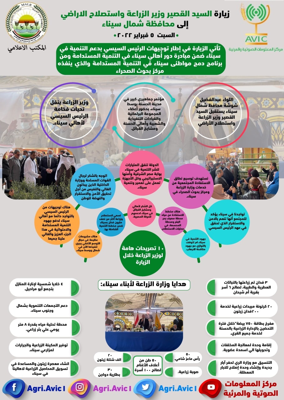 وجاء في انفوجراف وزارة الزراعة، إن الزيارة وزير الزراعة لجنوب سيناء كانت ضمن توجيهات الرئيس السيسي، والذي نصت على التواجد دائما مع أهالي سيناء لدفع جهود التنمية المستدامة والاحتوائية في هذا الجزء موجها الشكر لرجال القوات المسلحة ووزارة الداخلية الذين يبذلون الغالي والنفيس من أجل تحقيق الأمن والاستقرار والنهضة للوطن.