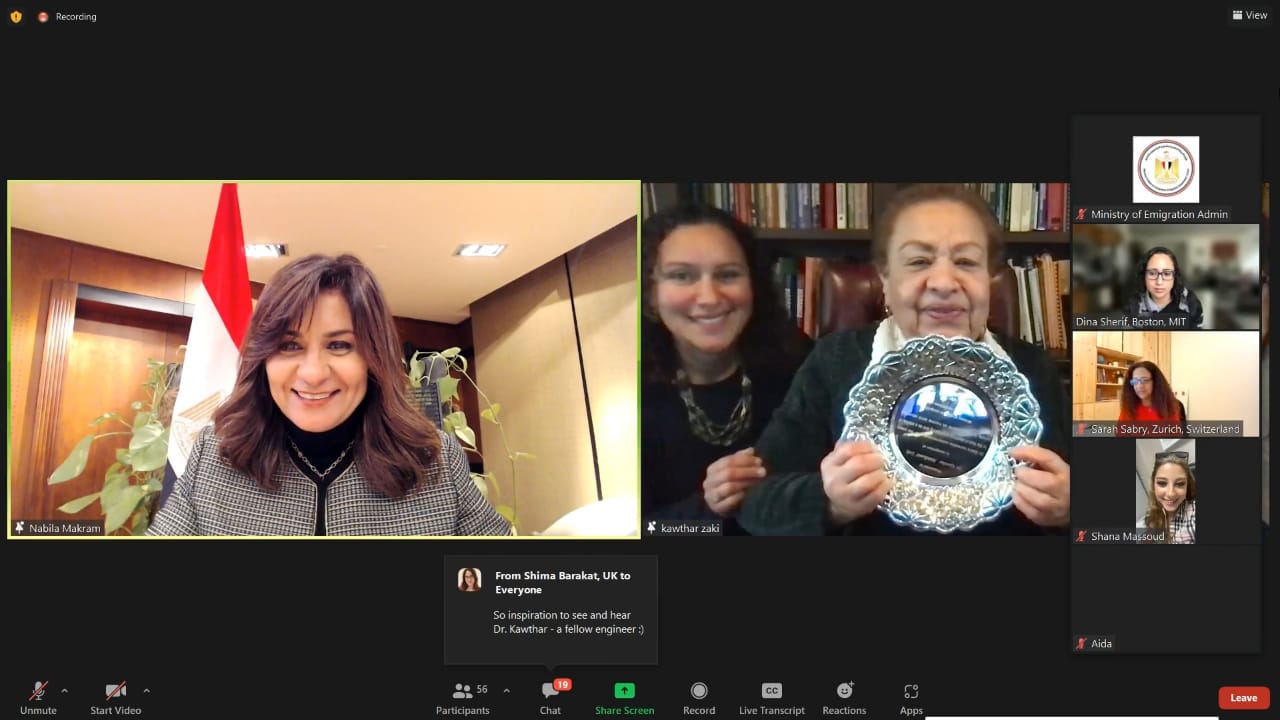 عقدت السفيرة نبيلة مكرم، وزيرة الدولة للهجرة وشئون المصريين بالخارج، لقاء تفاعليًا عبر تطبيق زووم مع عدد من المصريات النابغات والرائدات في عدة مجالات وتخصصات في الخارج، وعلى رأسهن الدكتورة المهندسة الكبيرة كوثر عبد الحميد زكي رائدة الهندسة الكهربائية بالولايات المتحدة الأمريكية.