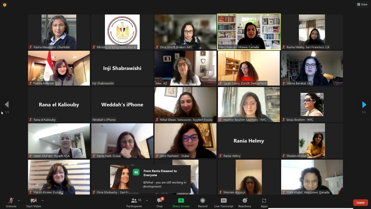وفي أعقاب ذلك، رحبت الوزيرة بالمشاركات جميعا وأعربت عن سعادتها بالتواصل معهن وفخرها بهن، مقدمة الشكر إلى الدكتورة دينا شريف، الخبير المصري بالولايات المتحدة الأمريكية والمدير التنفيذي لمركز لاجاتوم التابع لجامعة MIT، على تجميعهن وتقديمهن إلى وزارة الهجرة للتعرف عليهن والاطلاع على رحلة كفاحهن للاستفادة منها، وأكدت سيادتها اهتمام الوزارة بتسليط الضوء على النابغات من المصريات المهاجرات، ولفتت إلى تنظيم الوزارة لمؤتمر "مصر تستطيع بالتاء المربوطة" عام 2017 الذي جمع تحت مظلته هؤلاء المصريات من دول العالم، مشددة على أن المرأة المصرية تعيش الآن عصرًا ذهبيًا في عهد الجمهورية الجديدة تحت قيادة فخامة السيد الرئيس عبد الفتاح السيسي وهذا يتضح من تمثيلها في الحكومة من خلال 8 حقائب وزارية وكذلك في مقاعد البرلمان.