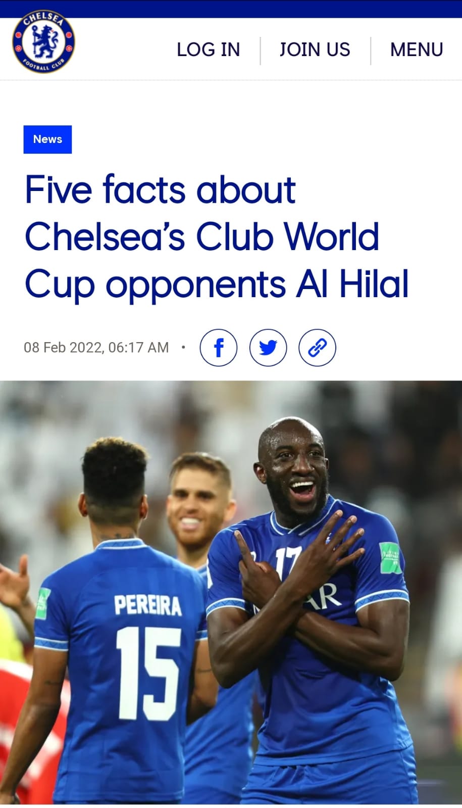 وتحدث تقرير الموقع الرسمي للنادي اللندني عن سيطرة الزعيم السعودي على الألقاب المحلية والآسيوية، كما حذر من خطورة بعض اللاعبين في الهلال، ومن بينهما البرازيلي ماثيوس بيريرا الذي سجل هدفين في مرمى البلوز من قبل، بجانب الثلاثي موسي ماريجا وأوديون إيجالو وأندريه كاريلو.