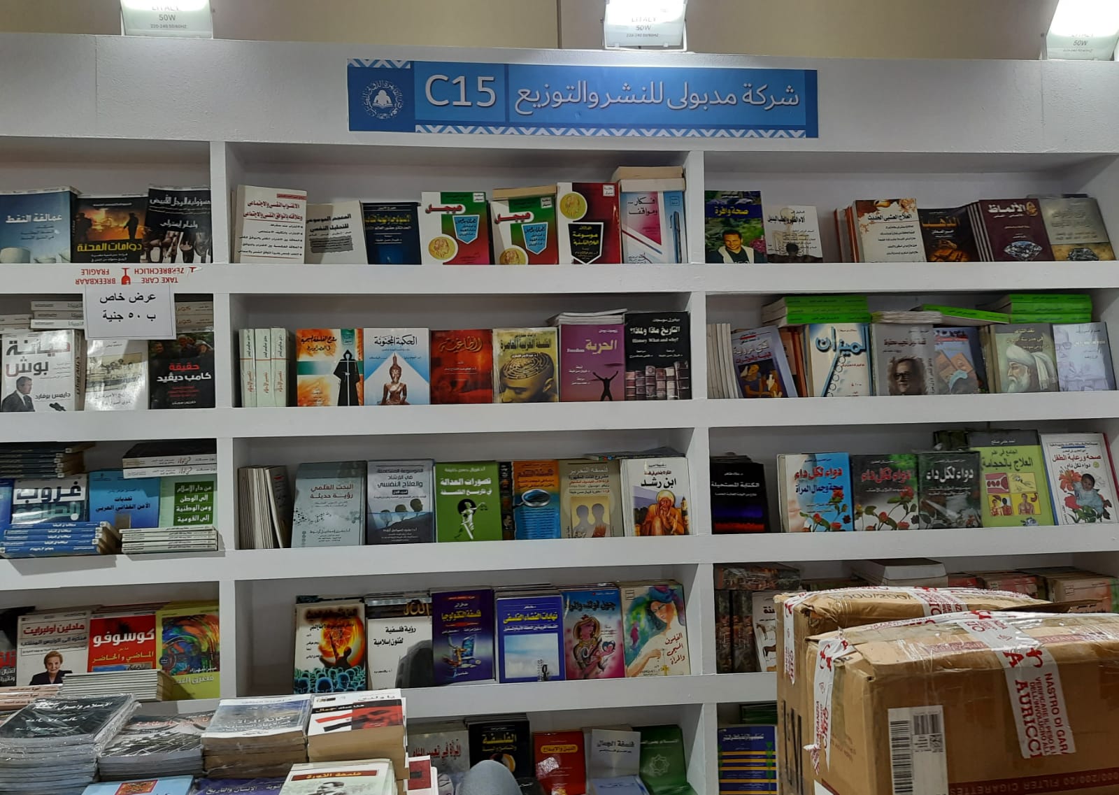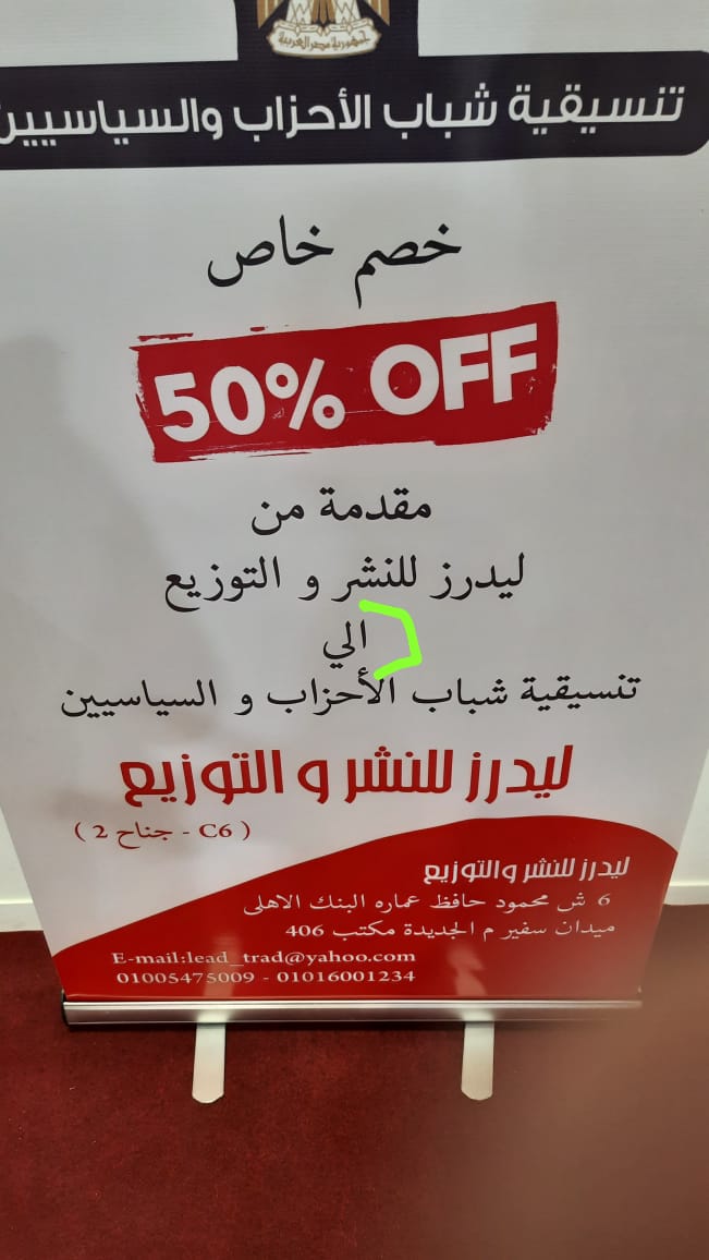 وخلال الجولة وجدنا لافتة خصم مقدمة من دار نشر إلى تنسيقية شباب الأحزاب والسياسيين، وشملت اللافتة خطأ إملائى، في حرف الجر إلي، حيث تمت كتابة الجملة كالتالى: (دار ليدرز للنشر والتوزيع إلى تنسيقية شباب الأحزاب والسياسيين)، والصواب أن تُكتب (دار ليدرز للنشر والتوزيع إلى تنسيقية شباب الأحزاب والسياسيين).