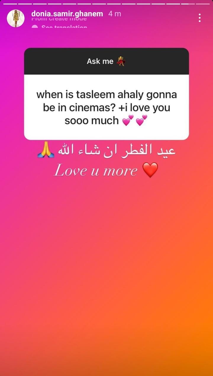وردت دنيا سمير غانم على سؤال جاء إليها، مضمونه حول موعد طرح فيلمها الجديد تسليم أهالي، وذلك من خلال خاصية استوري على حسابها الرسمي بموقع تبادل الصور والفيديوهات، انستجرام، وأجابت: في عيد الفطر إن شاء الله.