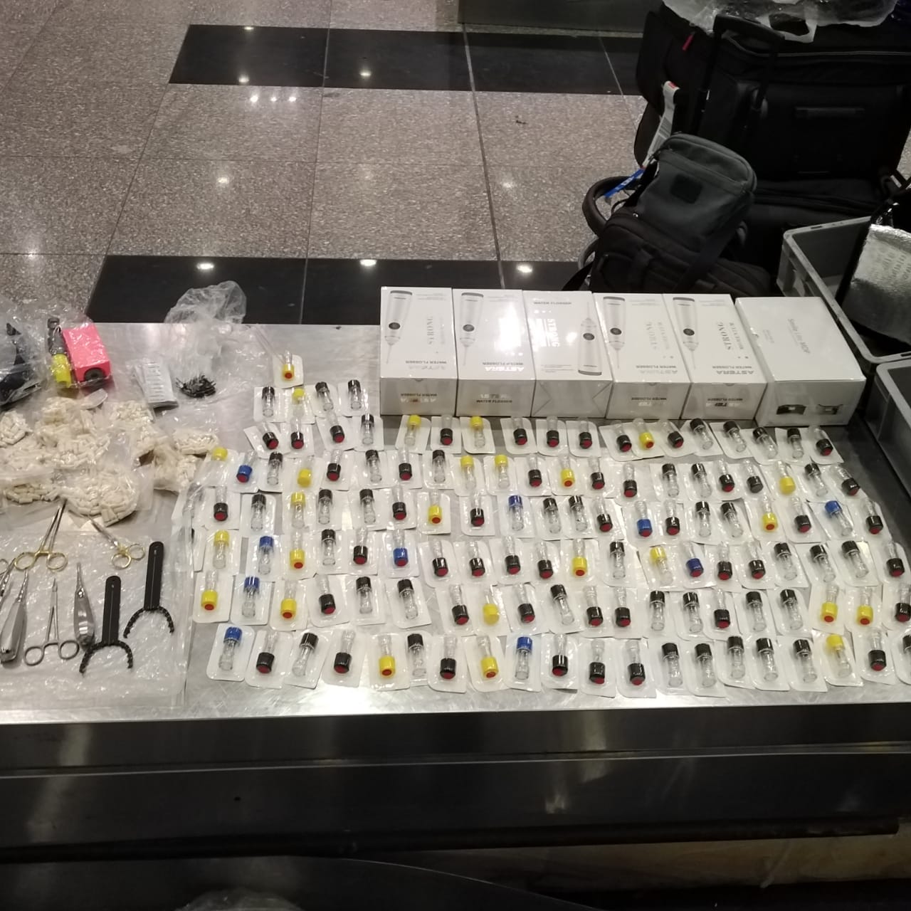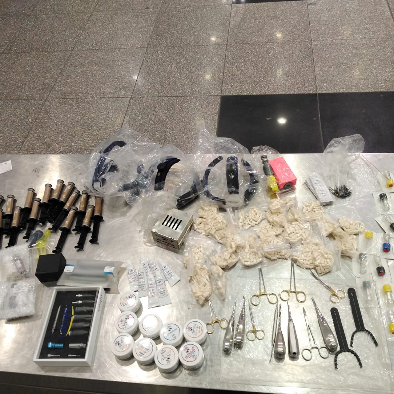 وعلى الفور، قام أحمد محمود البسيوني مدير الحركة المشرف على صالة الوصول بمبني الركاب رقم 2 بتكليف جورج صفوت مأمور الجمرك بتفتيش حقائب الراكب يدويًا، مما أسفر عن وجود كميات خاصة بزرع الأسنان والأكليريك مخبأة داخل ماكينة قهوة وكميات أخرى داخل أكياس الشيكولاتة، وكميات أخرى داخل ماتور خاص بكرسي الأسنان.