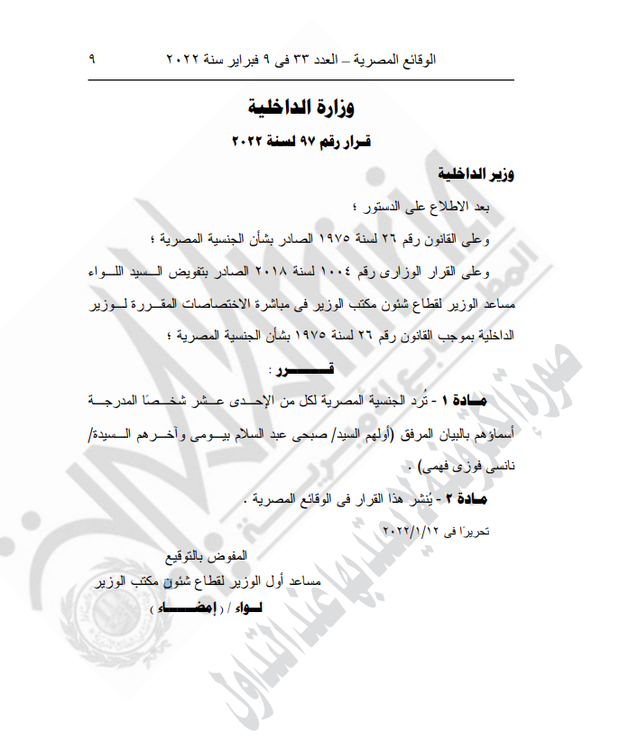 نشرت الجريدة الرسمية في عددها الصادر اليوم 9 فبراير 2022، قرارات لوزارة الداخلية بشأن الجنسية المصرية وردها لعدد من المواطنين، وحرمان آخرين منها.