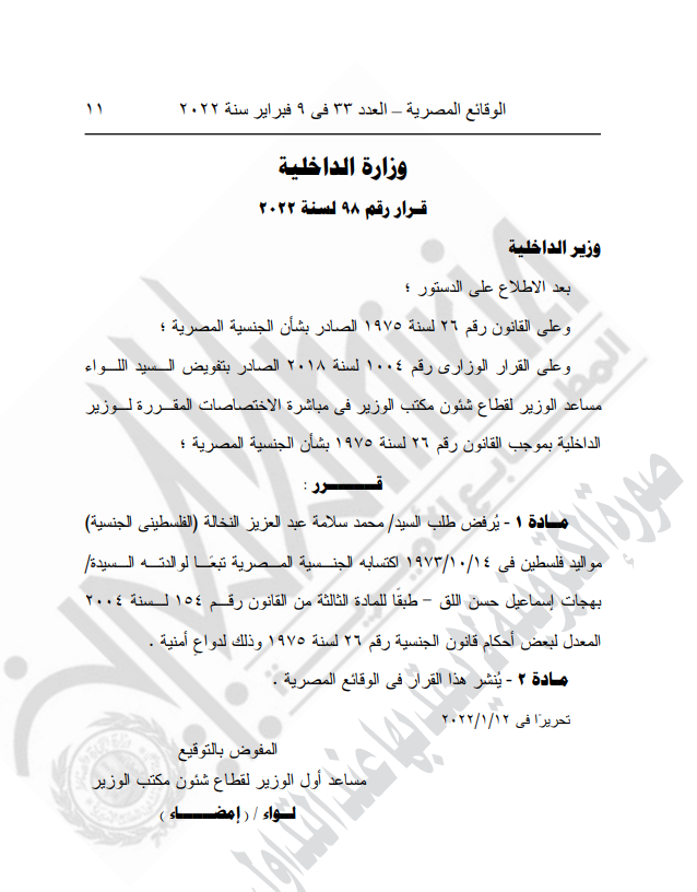وأشار القرار إلى رفض طلب محمد سلامة عبد العزيز النخالة، فلسطيني الجنسية، مواليد فلسطين في 14-10-1973، اکتسابه الجنسية المصرية تبعًا لوالدته بهجات إسماعيل حسن اللق، طبقا للمادة الثالثة من القانون رقم 154 لسنة 2004، المعدل لبعض أحكام قانون الجنسية رقم 36 لسنة 1970، وذلك لدواع أمنية.