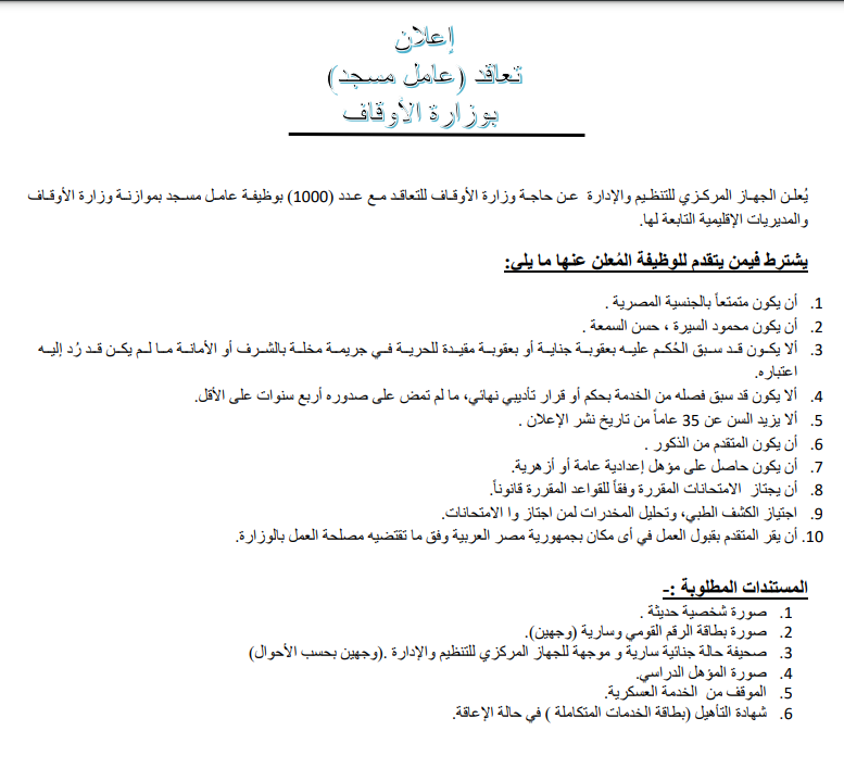 ومن المستندات المطلوب تقديمها لمسابقة وزارة الأوقاف؛ صورة شخصية حديثة، وصورة بطاقة الرقم القومي، بالإضافة إلى صحيفة جنائية سارية، ومُوجهة للجهاز المركزي للتنظيم والإدارة.