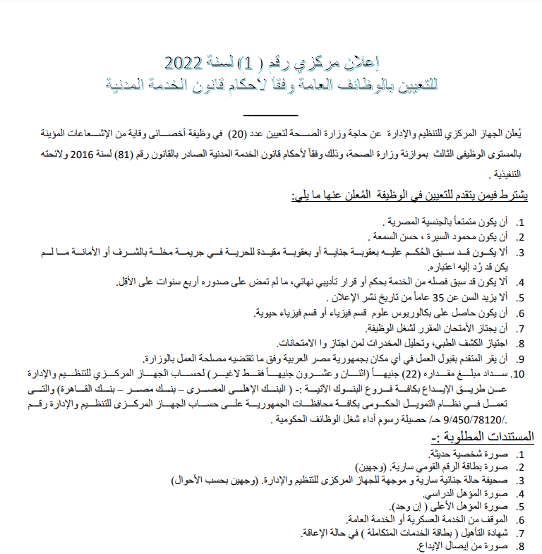 ويستعرض القاهرة 24؛ قائمة بتفاصيل مسابقات التعيينات الحكومية 2022، والشروط والمستندات المطلوبة من خلال السطور التالية: