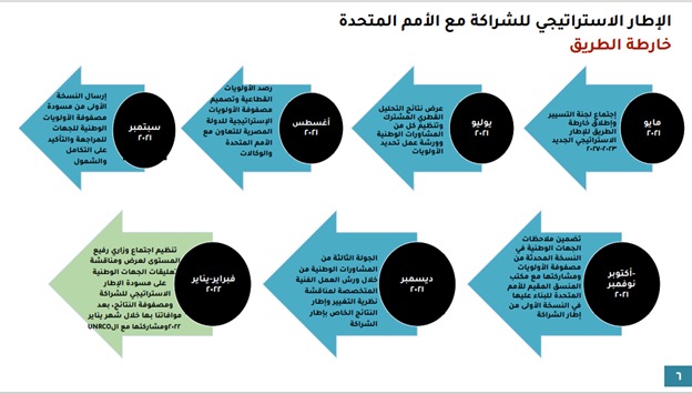 منذ إطلاق وزارة التعاون الدولي، المشاورات الموسعة في مايو 2021، تم تنفيذ عدد من المراحل التي أثمرت عن العديد من الرؤى القطاعية والاستراتيجية لبلورة مخرجات الإطار الاستراتيجي، للتعاون مع الأمم المتحدة من أجل التنمية المستدامة 2023-2027، تضمنت عرض نتائج التحليل القطري المشترك وتنظيم مشاورات مستمرة وورش عمل لتحديد الأولويات التنموية، ورصد الأولويات الاستراتيجية للدولة والقطاعية القطاعية، ومراجعة الأولويات بشكل مستمر مع الجهات المعنية للتأكيد على فكرة التكامل والشمول والتنسيق المستمر بما يضمن الوصول لأفضل المخرجات في إعداد الإطار الاستراتيجي، وعقد اليوم الاجتماع الوزاري رفيع المستوى لعرض ومناقشة تعليقات الجهات الوطنية حول مسودة الإطار الاستراتيجي للشراكة ومصفوفة النتائج.