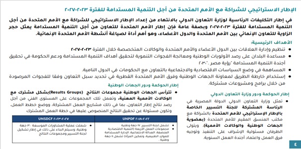 بدأت وزارة التعاون الدولي، ومكتب الأمم المتحدة في مصر، عملية مشاورات موسعة في عام 2021، بمشاركة نحو 30 جهة وطنية من الوزارات والهيئات والمجالس القومية، إلى جانب 28 من الوكالات والبرامج التابعة للأمم المتحدة، لإعداد الإطار الاستراتيجي للشراكة بين جمهورية مصر العربية والأمم المتحدة 2023-2027 UNSDCF، والذي يعد الإطار الرئيسي للشراكة بين الجانبين، بهدف تعزيز العلاقات في مختلف المجالات، وتوجيه مساهمات الأمم المتحدة للتكامل مع أولويات الحكومة التنموية، ودفع رؤية مصر للتنمية المستدامة 2030.