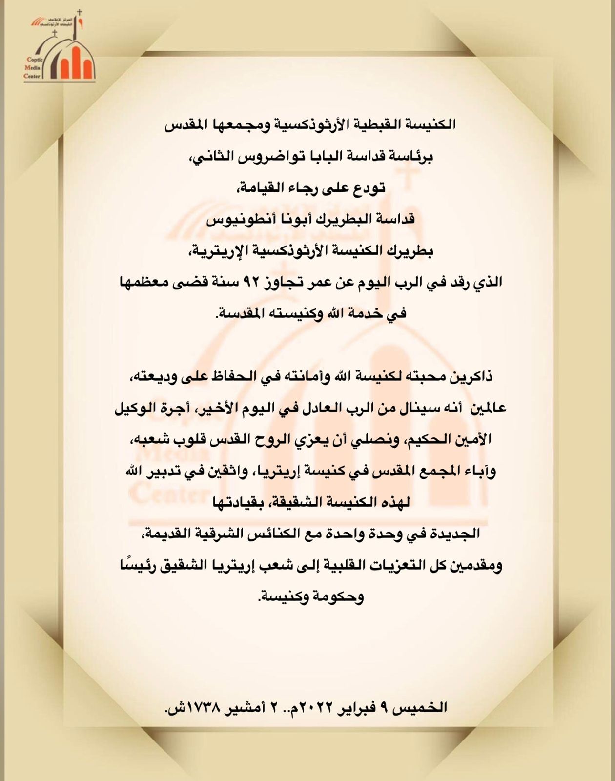 وقالت الأرثوذكسية في نعيها: الكنيسة القبطية الأرثوذكسية ومجمعها المقدس برئاسة قداسة البابا تواضروس الثاني، بابا الإسكندرية وبطريرك الكرازة المرقسية، تودع على رجاء القيامة، قداسة البطريرك أبونا أنطونيوس بطريرك الكنيسة الأرثوذكسية الإريترية، الذي رقد في الرب اليوم عن عمر تجاوز 92 سنة قضى معظمها في خدمة الله وكنيسته المقدسة.