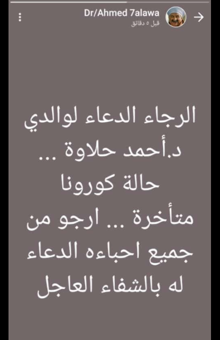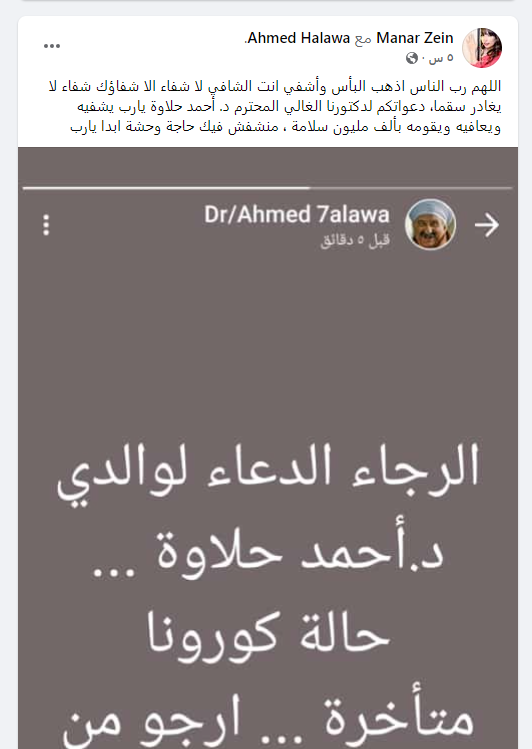 وقال نجل الفنان أحمد حلاوة، في منشور على موقع فيسبوك: الرجاء الدعاء لوالدي أحمد حلاوة، حالة كورونا متأخرة، أرجو من جميع أحبائه الدعاء له بالشفاء العاجل.
