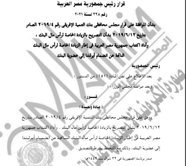 نشرت الجريدة الرسمية في عددها رقم 6 الصادر اليوم 10 فبراير 2022، قرار الرئيس عبد الفتاح السيسي رئيس جمهورية مصر العربية، بشأن الموافقة على قرار مجلس محافظي بنك التنمية الإفريقي، رقم 2019 /4 الصادر بتاريخ 2019/9/12، بشأن التصريح بالزيادة الخاصة لراس مال البنك وأداة اكتتاب جمهورية مصر العربية، في إطار الزيادة الخاصة لرأس مال البنك الناتجة عن انضمام إيرلندا إلى عضوية البنك.