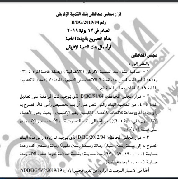 ونصت المادة الأولي: ووفق على قرار مجلس محافظي بنك التنمية الإفريقي رقم 2019/4 الصادر بتاريخ 2019/9/12 بشأن أعمال البنك، وأداة اكتتاب جمهورية مصر العربية، في إطار الزيادة الخاصة لرأس مال البنك الناتجة عن انضمام إيرلندا إلى عضوية البنك، وذلك مع التحفظ بشرط التصديق.