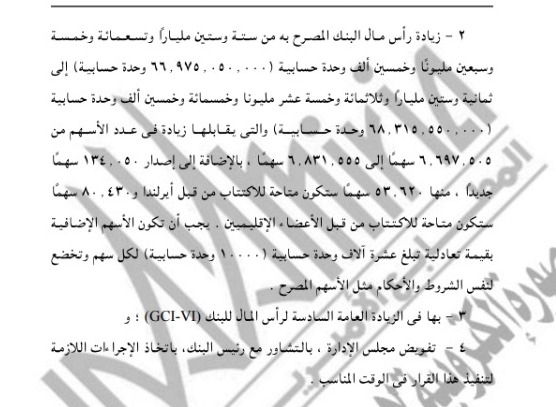 3 - قرار مجلس المحافظين 2012/04/B/BG الذي بموجبه تم زيادة رأس مال البنك المصرح به إلى 67 مليارا ومائة وتسعة وستين مليونا ومائة وتسعين ألف وحدة حسابية (17،199،190،000 وحدة حسابية) بقسمة تعادلية قدرها عشرة آلاف وحدة حسابية (10،000 وحدة حسابية)