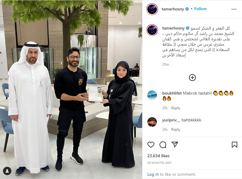ونشر تامر حسني، صورة له أثناء استلامه بطاقة السعادة، عبر حسابه الشخصي بموقع تبادل الصور والفيديوهات إنستجرام، وكتب قائلًا: كل الفخر والشكر لسمو الشيخ محمد بن راشد آل مكتوم حاكم دبي، على تقديره الغالي لشخصي وفني كفنان مصري عربي، من خلال منحي بطاقة السعادة؛ التي تمنح لكل من يساهم في إسعاد الآخرين.