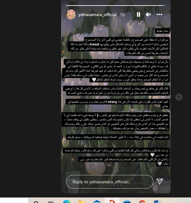وحول طلاق سمارة يحيى من محمد أبو جبل أضافت سمارة يحيى: كلام كثير في خاطري تصريحات وإشاعات كاذبة وناس استغلت الموقف وأذواني كل هذا راح ييجي التوقيت المناسب ونتكلم فيه، حطو في بالكم إني جزائرية حرة والجزائرية عمرها ما طيح الحمد الله، أخيرا نقول لناس كثيرة راهي تشوف الآن في هاذ story كلام من تجارب ودروس تعلمتها في حياتي.