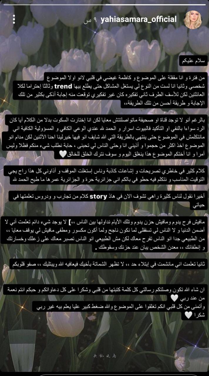 واستكملت يحيى عبر منشور لها في خاصية استوري، كلام كتير وإشاعات كاذبة وناس استغلت الموقف واذوني، كل هذا راح ييجي التوقيت المناسب، حطوا في بالكم إني جزائرية حرة والجزائرية عمرها ما طيح الحمد لله.