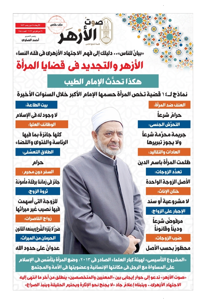 أصدرت جريدة صوت الأزهر، ملفا تذكاريا دليل إرشادي لفَهم الاجتهاد الأزهري في فقه النساء، واستعرضت خلاله 14 قضية حسمها الإمام الأكبر الدكتور أحمد الطيب، شيخ الأزهر الشريف، في تجديد قضايا المرأة.