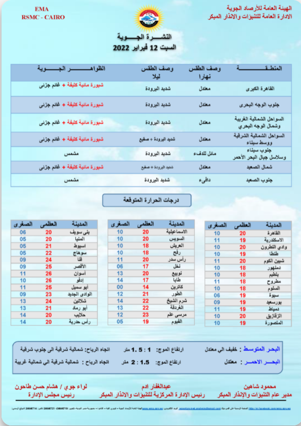 وأشارت الهيئة، في نشرتها الجوية، إلى تكاثر الغيوم في سماء معظم محافظات الجمهورية، موضحة حالة الملاحة البحرية على البحرين الأحمر والمتوسط التي تتراوح من خفيفة إلى معتدلة ويصل ارتفاع الأمواج إلى 2 متر فوق سطح البحر.