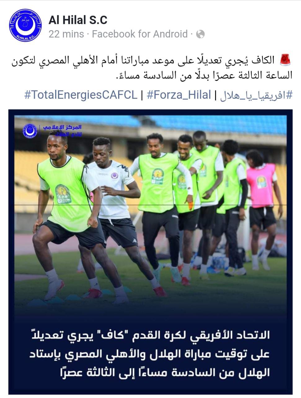 وأشار الهلال عبر صفحته الرسمية بموقع التواصل الاجتماعي فيسبوك، إلى أنه تلقى إخطارا من الاتحاد الإفريقي لكرة القدم كاف، يبلغه فيه بتقديم موعد انطلاق مباراته ضد الأهلي إلى تمام الساعة الثالثة عصرا.