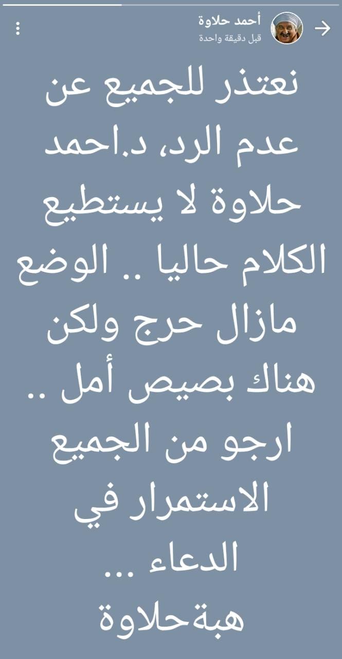 وكتبت هبة حلاوة عبر خاصية ستوري لحساب والدها على موقع التواصل الاجتماعي واتس آب، الآتي: نعتذر للجميع عن عدم الرد، د. أحمد حلاوة لا يستطيع الكلام حاليًا، الوضع مازال حرجا، ولكن هناك بصيص من الأمل، أرجو من الجميع الاستمرار في الدعاء، هبة حلاوة.