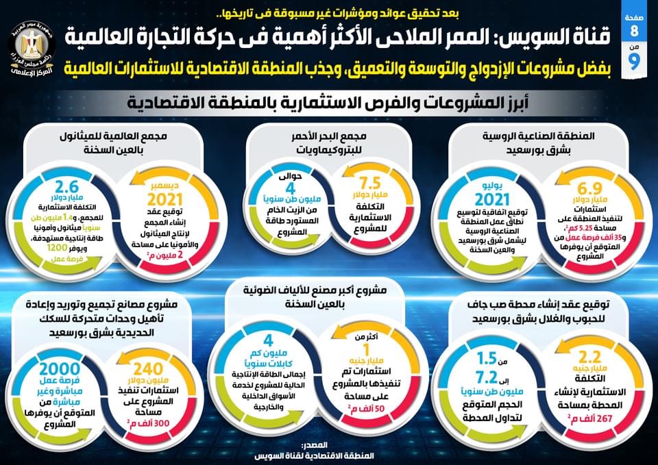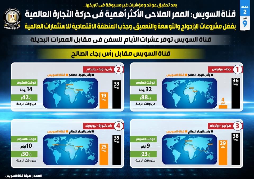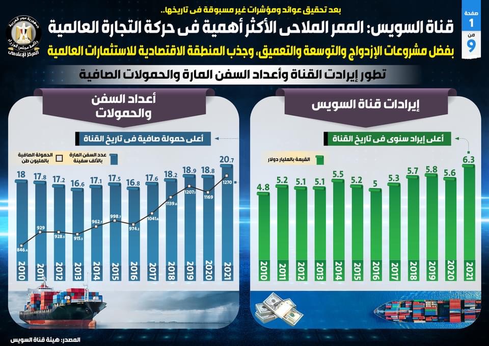 نشر المركز الإعلامي لمجلس الوزراء، تقريرًا تضمن إنفو جرافات تسلط الضوء على قناة السويس الممر الملاحي الأكثر أهمية في حركة التجارة العالمية بفضل مشروعات الازدواج والتوسعة والتعميق، وجذب المنطقة الاقتصادية للاستثمارات العالمية، وذلك بعد تحقيق عوائد ومؤشرات غير مسبوقة في تاريخها.