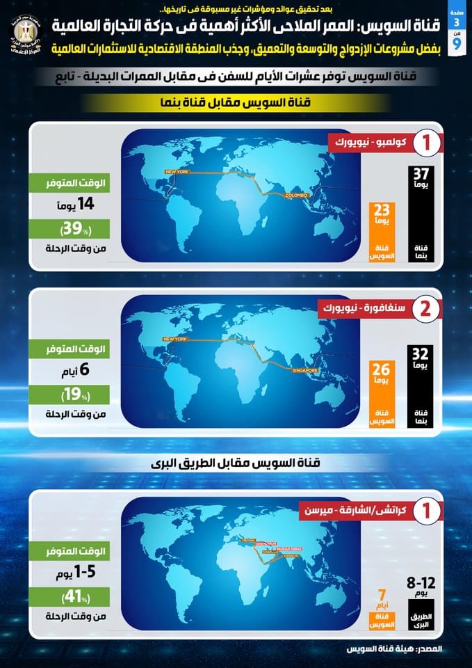 وفيما يتعلق بالطريق من سنغافورة إلى نيويورك فيستغرق 26 يومًا عن طريق قناة السويس مقارنة بـ 32 يومًا خلال قناة بنما، ليصل الوقت المتوفر إلى 6 أيام بنسبة 19% من وقت الرحلة، بينما يستغرق المرور عبر الطريق البري طريق كراتشي/الشارقة – ميرسن من 8 لـ 12 يومًا مقابل 7 أيام فقط عن طريق قناة السويس، ليتراوح الوقت المتوفر من يوم إلى 5 أيام بنسبة 41% من وقت الرحلة.