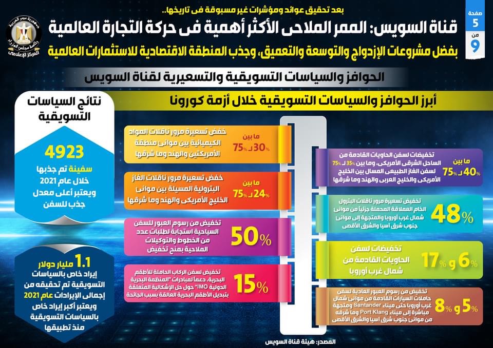 واستعرض التقرير نتائج السياسات التسويقية عام 2021، والتي تمثلت في جذب 4923 سفينة، والذي يعد أعلى معدل جذب للسفن، بالإضافة إلى تحقيق 1.1 مليار دولار خاص بالسياسات التسويقية، ويعتبر كذلك أكبر إيراد خاص بالسياسات التسويقية منذ تطبيقها.