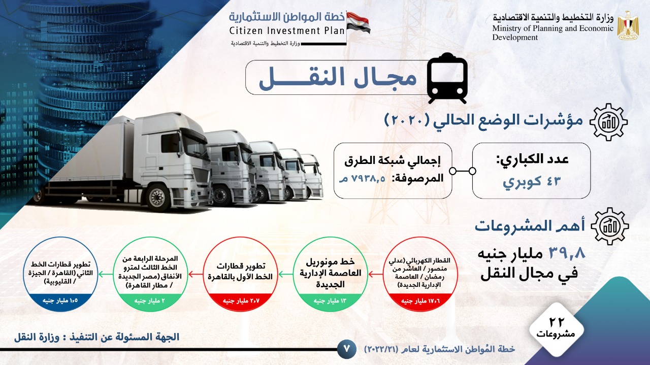 و أشار تقرير وزارة التخطيط والتنمية الاقتصادية، فيما يتعلق بالتوزيع القطاعي للاستثمارات العامة المستهدفة بمحافظة القاهرة بخطة عام 21/2022 إلى توجيه استثمارات بقيمة 39،8 مليار جنيه لقطاع النقل بنسبة 48،6%، يليه قطاع الإسكان وتطوير العشوائيات بقيمة 17،7 مليار جنيه بنسبة 21،6%، وتبلغ استثمارات قطاع التعليم العالي والبحث العلمي 5،6 مليار جنيه بنسبة 6،8%، ويخص قطاع الصحة 3،9 مليار جنيه بنسبة 4،7%، وقطاع التنمية المحلية 3 مليار جنيه بنسبة 3،6%، أما القطاعات الأخرى فيخصها استثمارات بقيمة 11،9 مليار جنيه بنسبة 14،7%.