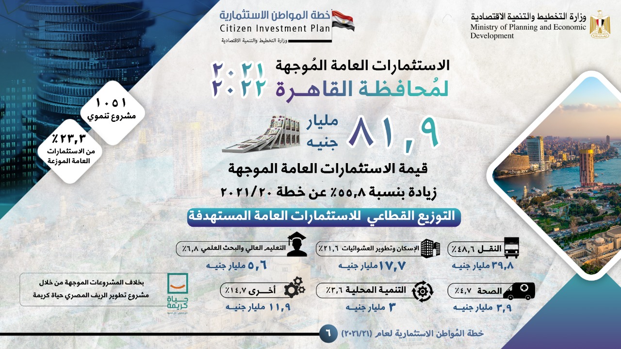 كشفت وزارة التخطيط والتنمية الاقتصادية، في تقرير صادر عنها، ملامح خطة المواطن الاستثمارية لمحافظة القاهرة لعام 21/2022، وذلك في إطار مواصلة الإعلان عن خطة المواطن، في كافة محافظات الجمهورية للعام الثالث على التوالي، بهدف توعية المواطنين بشأن توجهات وأولويات خطة التنمية المستدامة للعام المالي 21/2022، ودورها في تحقيق رؤية مصر 2030.