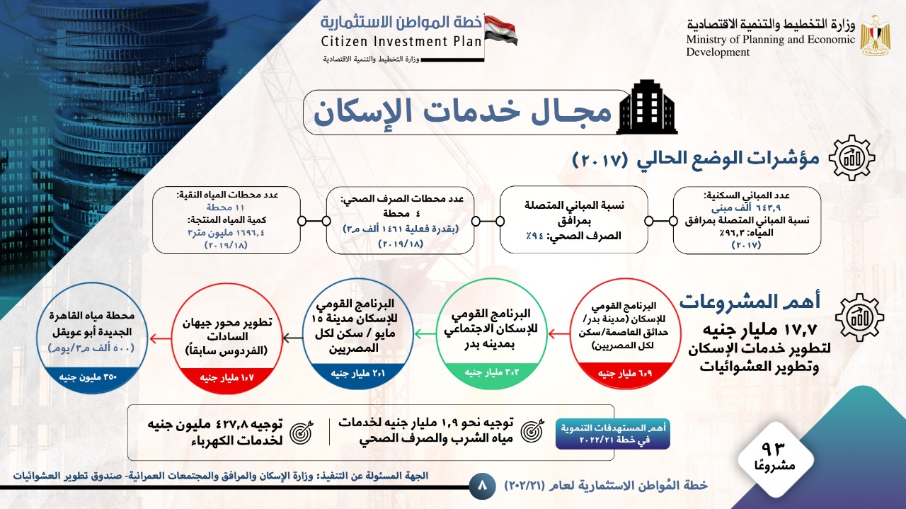 وأوضح التقرير، أن أهم المستهدفات التنموية بقطاع الإسكان بمحافظة القاهرة في خطة 21/2022، تتمثل في توجيه نحو 1.9 مليار جنيه لخدمات مياه الشرب والصرف الصحي، إلى جانب توجيه 427،8 مليون جنيه لخدمات الكهرباء، ويبلغ عدد مشروعات قطاع الإسكان 93 مشروعًا، وتتمثل أهم مشروعات قطاع النقل بالمحافظة، والتي يبلغ عددها 22 مشروعًا في مشروع القطار الكهربائي: عدلي منصور/العاشر من رمضان/العاصمة الإدارية الجديدة، مشروع خط مونوريل العاصمة الإدارية الجديدة، إلى جانب تطوير قطارات الخط الأول بالقاهرة، وفي قطاع التعليم العالي والبحث العلمي فمن المستهدف تنفيذ 135 مشروعًا تنمويًا منها إنشاء جامعة عين شمس الأهلية، إنشاء جامعة حلوان الأهلية، إنشاء مدينة العلوم والتكنولوجيا لأبحاث وصناعة الإلكترونيات، إلى جانب إنشاء الجامعة المصرية الفرنسية، وفي قطاع التنمية المحلية يستهدف تنفيذ 444 مشروعًا تنمويًا تضم مشروعات إنشاء وحدات سكنية، رصف شوارع رئيسية بنطاق المحافظة، فضلا عن إحلال وتجديد كباري سيارات ومشاه، وتتمثل أهم المستهدفات التنموية بقطاع التنمية المحلية في رصف طرق محلية بحوالي 1،2 مليار جنيه، وتوجيه 194،3 مليون جنيه لتدعيم شبكات الكهرباء بالمحافظة.