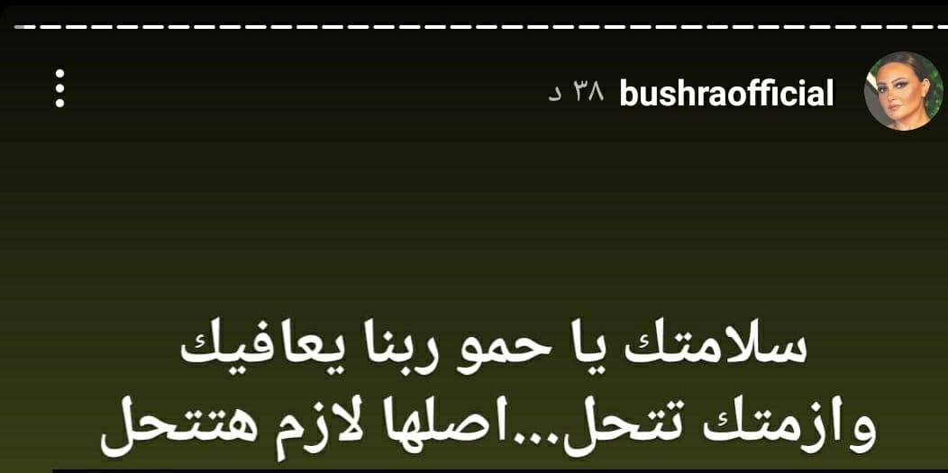 وكتب بشرى ستوري، عبر حسابها الشخصي بموقع تبادل الصور والفيديوهات القصيرة انستجرام، جاء فيها: سلامتك يا حمو ربنا يعافيك، وأزمتك تتحل، أصلها لازم هتتحل.