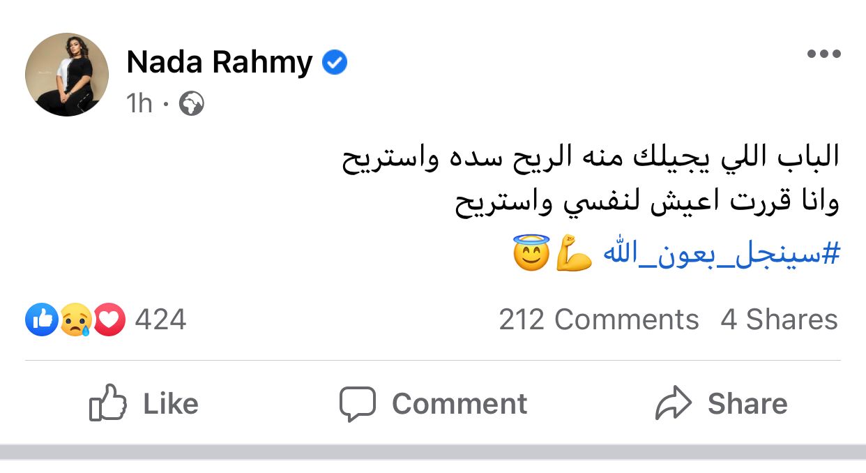وكتبت ندى رحمي عبر حسابها الرسمي على موقع التواصل الاجتماعي فيسبوك: الباب اللي يجيلك منه الريح سده واستريح.. وأنا قررت أعيش لـ نفسي واستريح.. سنجل بعون الله.