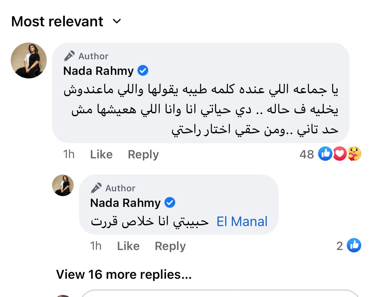وعلقت ندى رحمي على سؤال أحد المتابعين حول إمكانية التراجع في قرار الانفصال، قائلة: يا جماعة اللي عندة كلمة طيبة يقولها واللي ماعندوش يخليه في حاله.. دي حياتي أنا وأنا اللي هعيشها مش حد تاني.. ومن حقي أخد راحتي.. وأنا خلاص قررت.
